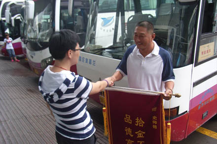 您現(xiàn)在的位置是:首頁 > 客運場站產(chǎn)業(yè) 拾金不昧 品德高尚 次 客運場站產(chǎn)業(yè) 發(fā)布時間:2012-07-06 19:01:31 拾金不昧 品德高尚 2012年7月2日,第一客運公司濟南至曲阜線路魯A46982駕駛員史元成同志,駕車抵達曲阜客運站,在整理車內衛(wèi)生時,發(fā)現(xiàn)有旅客遺落在車內的筆記本電腦一臺。史元成同志立即通知曲阜客運站,并設法尋找到了失主曲阜孔女士??着拷舆^筆記本電腦后萬分激動,當場拿出兩條香煙以示謝意,被史元成同志婉言謝絕,并表示這是身為山東交運一名普通駕駛員應該做的??着渴指袆?,對史元成同志這種拾金不昧的高尚品德和良好的職業(yè)情操表示贊許:“山東交運能夠有像史師傅這樣的優(yōu)秀駕駛員,也反映出你們公司是真正的誠信經(jīng)營、熱情服務。我信任你們!” (李浩)